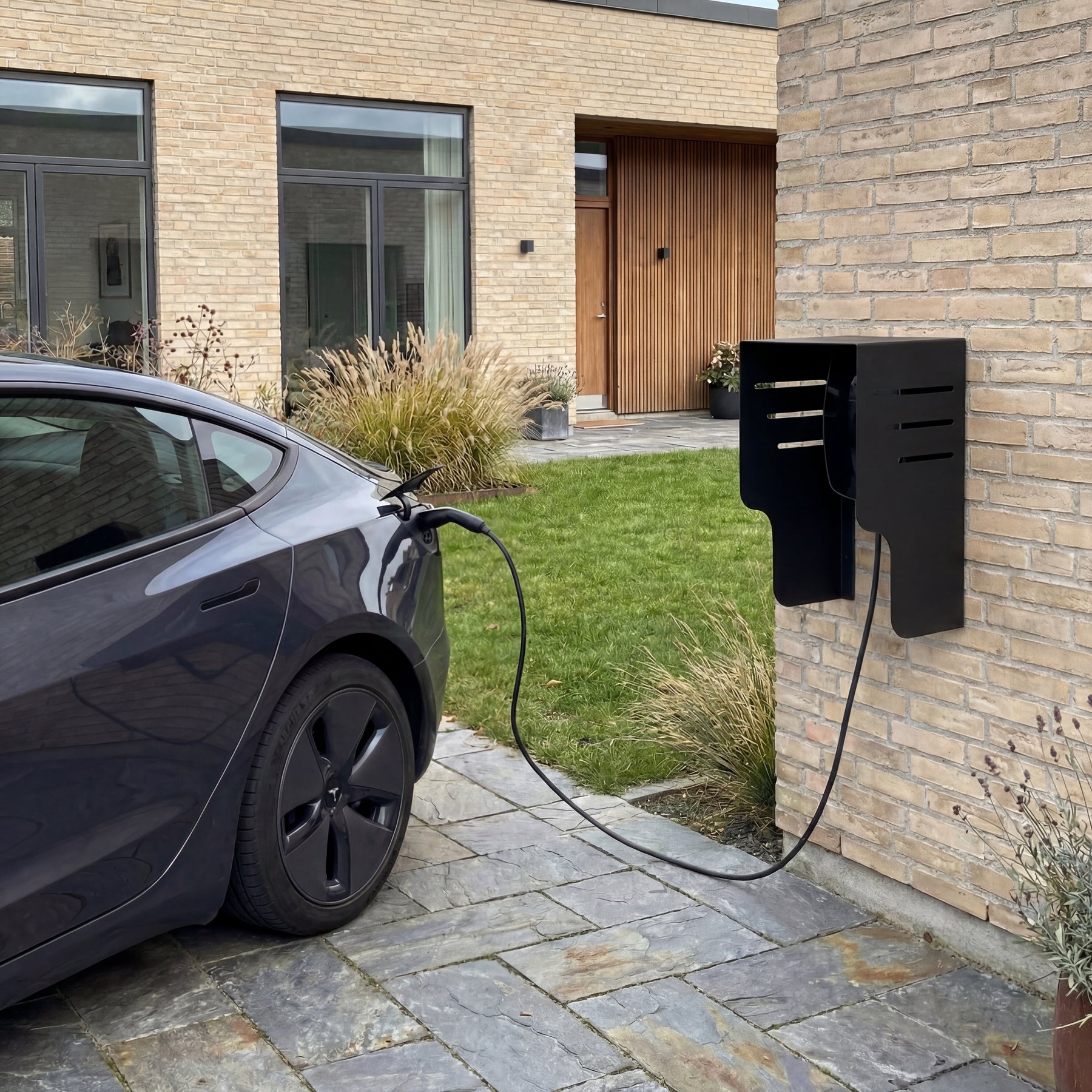 Letar du efter en estetisk lösning som kan skydda din laddbox mot vind och väder? Vår eleganta väggmonterade laddboxstolpe i svart pulverlackering är det perfekta svaret på utmaningar med regn, snö och slask. Den är designad för att passa modern bostadsarkitektur och integreras harmoniskt i husets fasad.