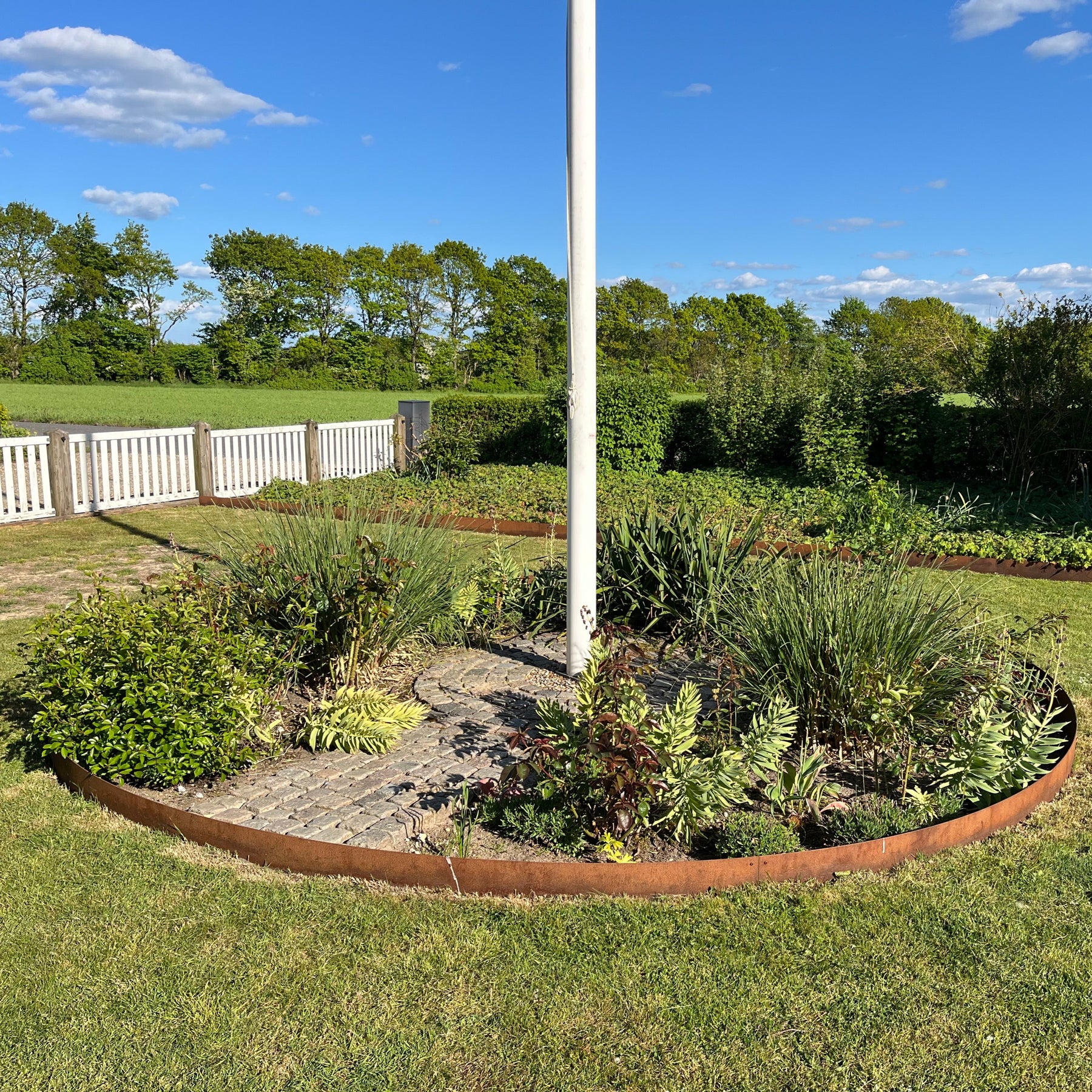 Rund rabattkant i 3 mm cortenstål tillverkad av Stålträdgården. Perfekt för att avgränsa en rund bädd, placera runt flaggstången eller mitt på gården. Möjligheterna är många.