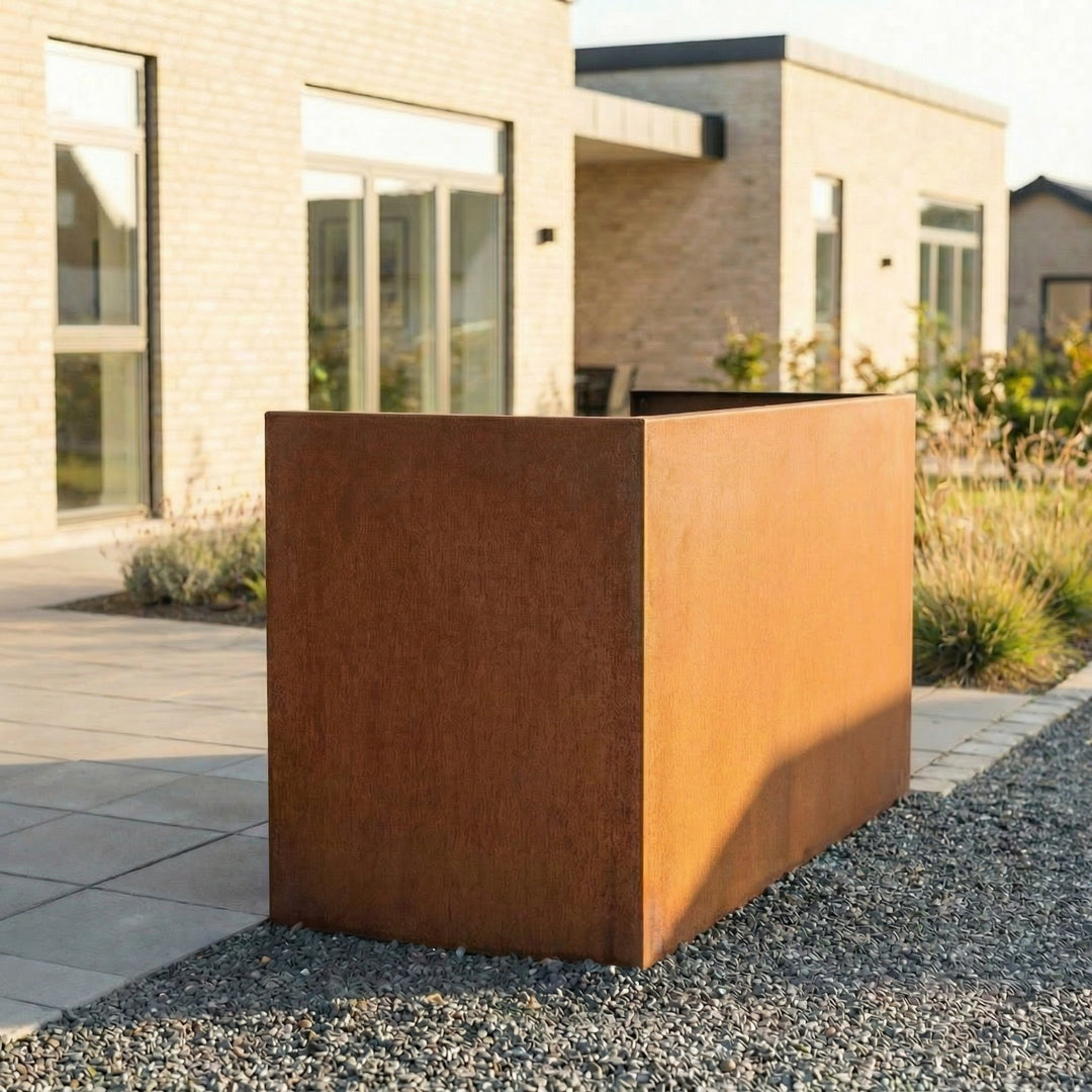 Kom ihåg att våra skydd av cortenstål är utformade för att utveckla sitt distinkta utseende med tiden. Beroende på vädret kommer ditt nya soptunneskydd att få en vacker rostig yta, vilket ger det ett naturligt, jordnära utseende som det kommer att behålla i många år framöver utan att du behöver göra någonting.