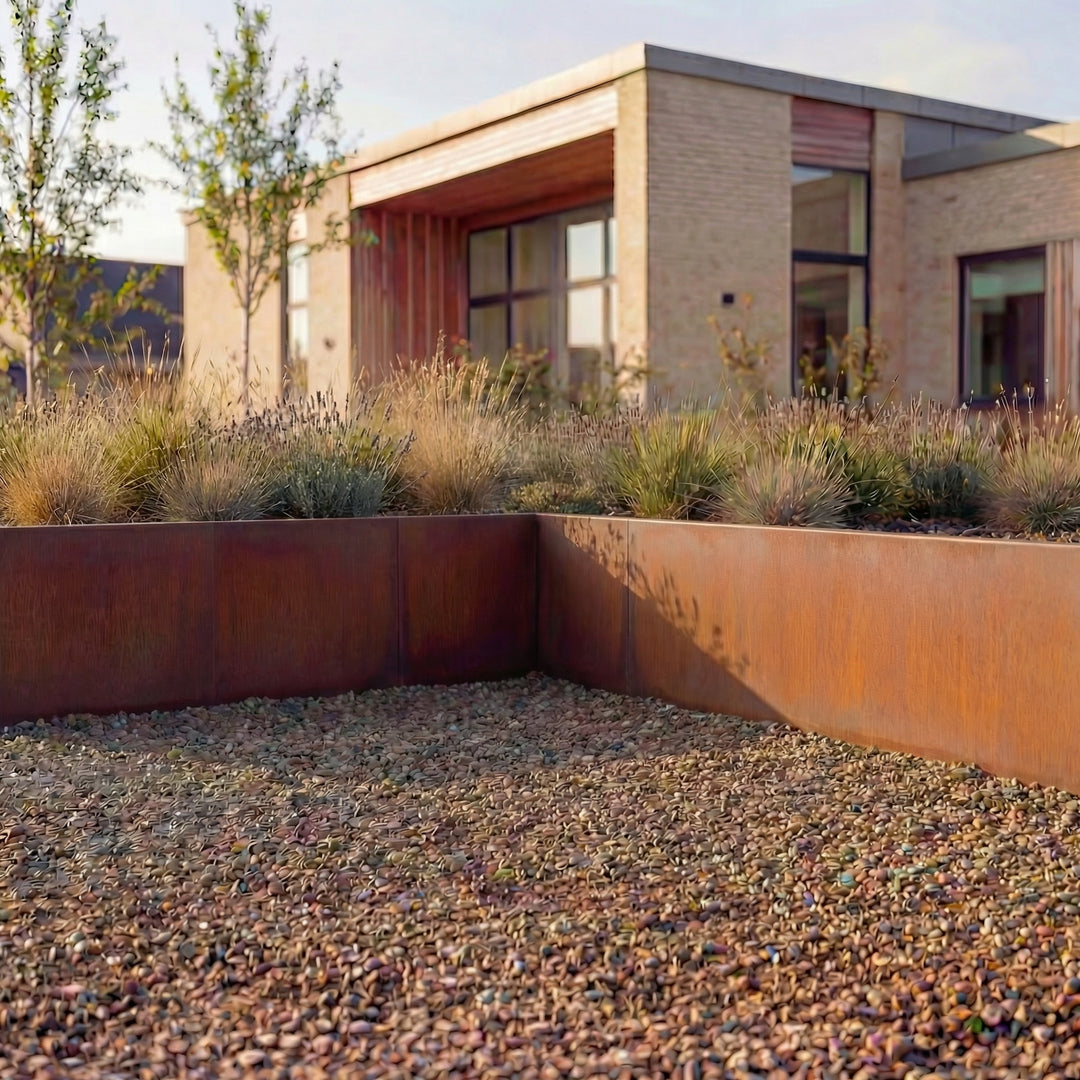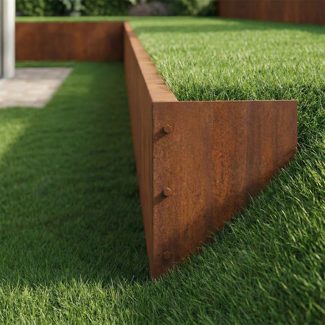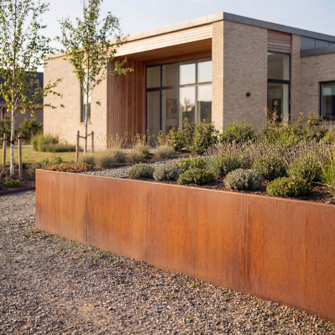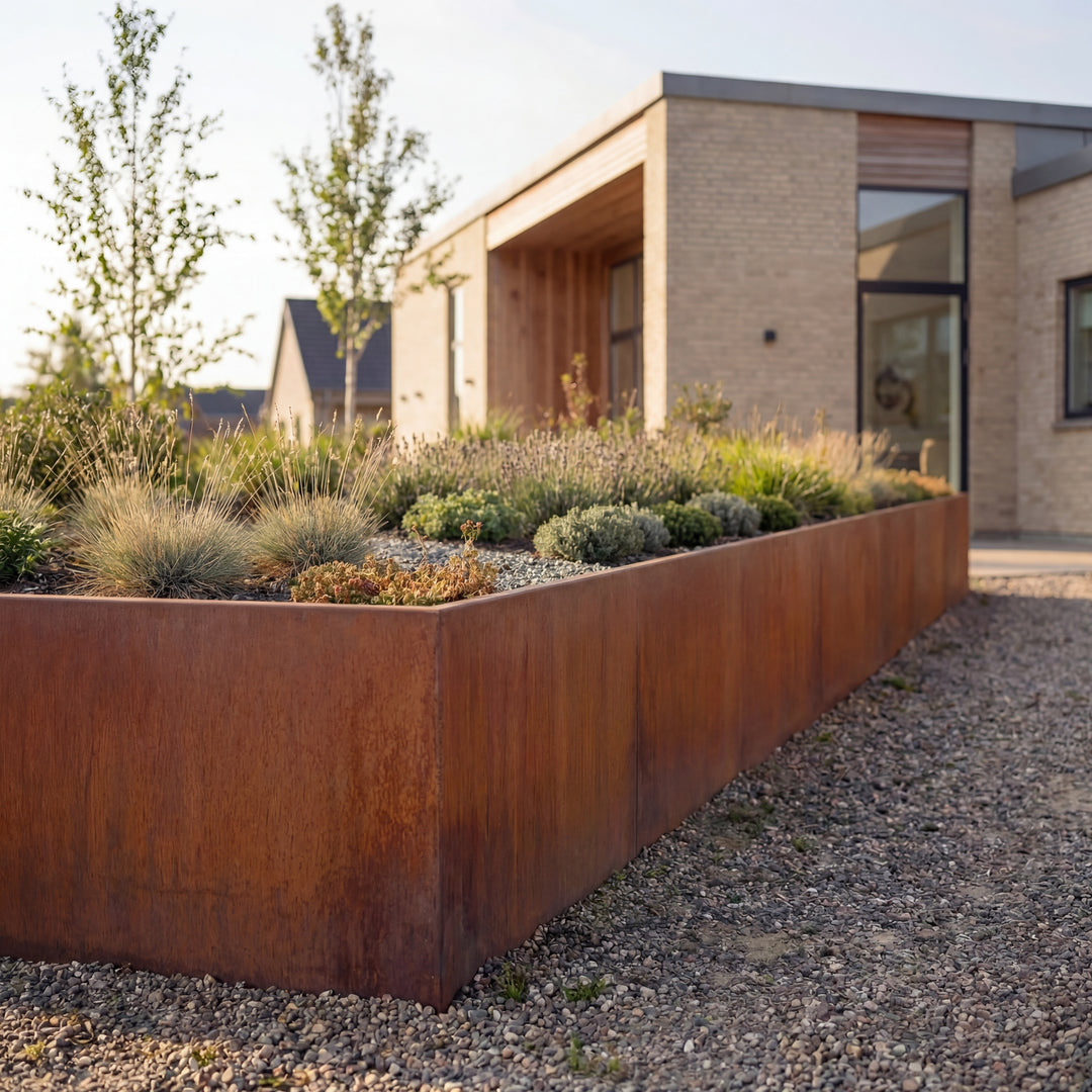 De flesta väljer cortenstål på grund av dess naturliga rostpatina, som ger det ett varmt, naturligt men ändå modernt utseende som passar alla hem, företag och byggnader. När det gäller stödmurar får du också en betydande hållbarhet i stålet, eftersom den karaktäristiska rosten ger din nya stödmur ett gynnsamt skydd mot korrosion och rostangrepp. Det innebär att du kan förvänta dig att din stödmur i cortenstål har en mycket lång livslängd och därmed kräver minimalt med underhåll, vilket är fallet med stödmurar tillverkade av alternativa material.